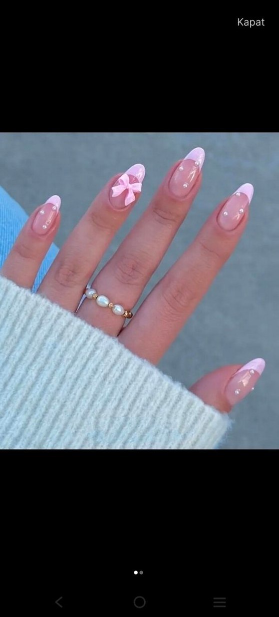 Pembe pastel tonlarda, fiyonk ve inci detaylı zarif tırnak süslemeleri. 24'lü.