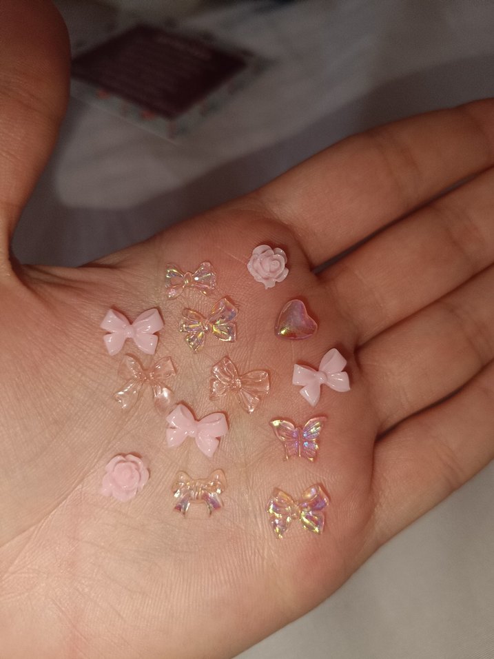 Pembe pastel tonlarda, fiyonk, gül ve kelebek şeklinde tırnak süslemeleri içeren set. Hafif parlak görünümlü, zarif tırnak tasarımları için uygun.