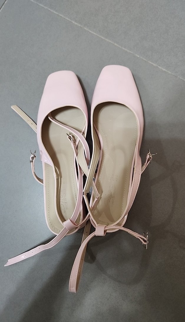 Pembe pastel renkte, tokalı kayışlı kadın babetler. Minimalist ve normcore tarzda, günlük kullanıma uygun, stiletto topuklu ve kauçuk malzemeden.39 numaradır.