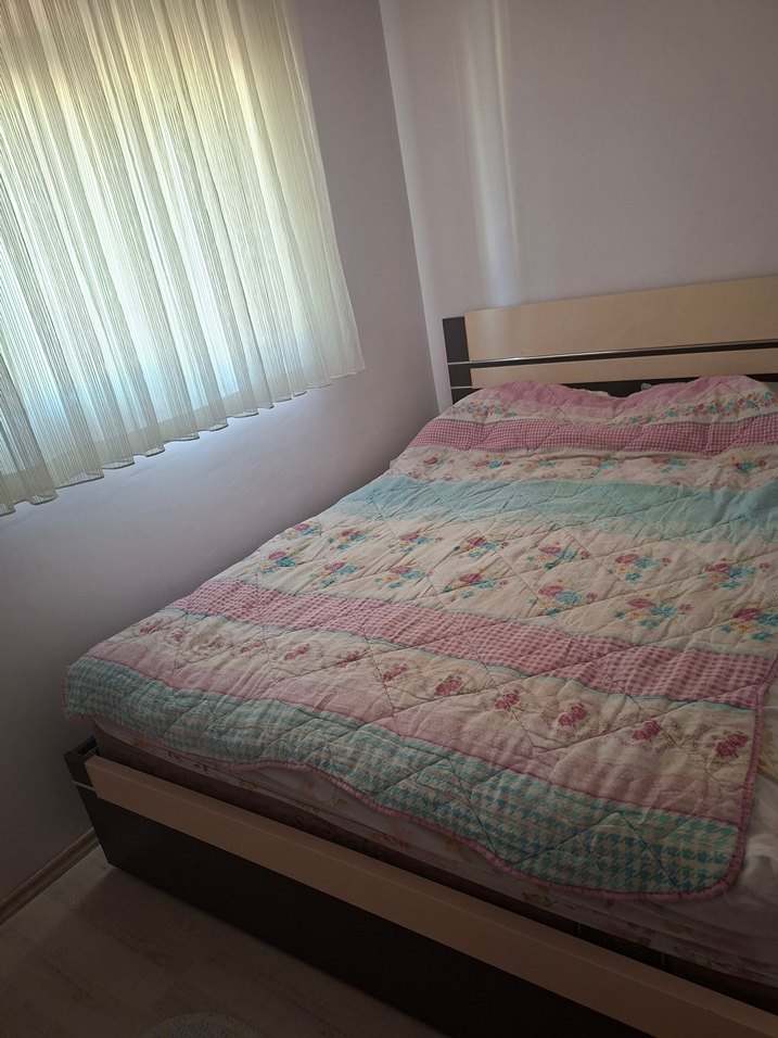 Pastel pembe tonlarında, batik desenli ve yumuşak dokulu yatak örtüsü, yatak odasına hafif bir dokunuş katıyor.