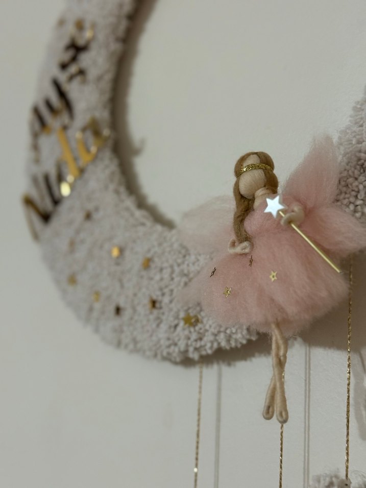 Yumuşak tüylü detaylara ve yıldızlı asa aksesuarına sahip pembe pastel renkli peri bebek kapı süsü ve takı yastığı ile birlikte fiyatıdır