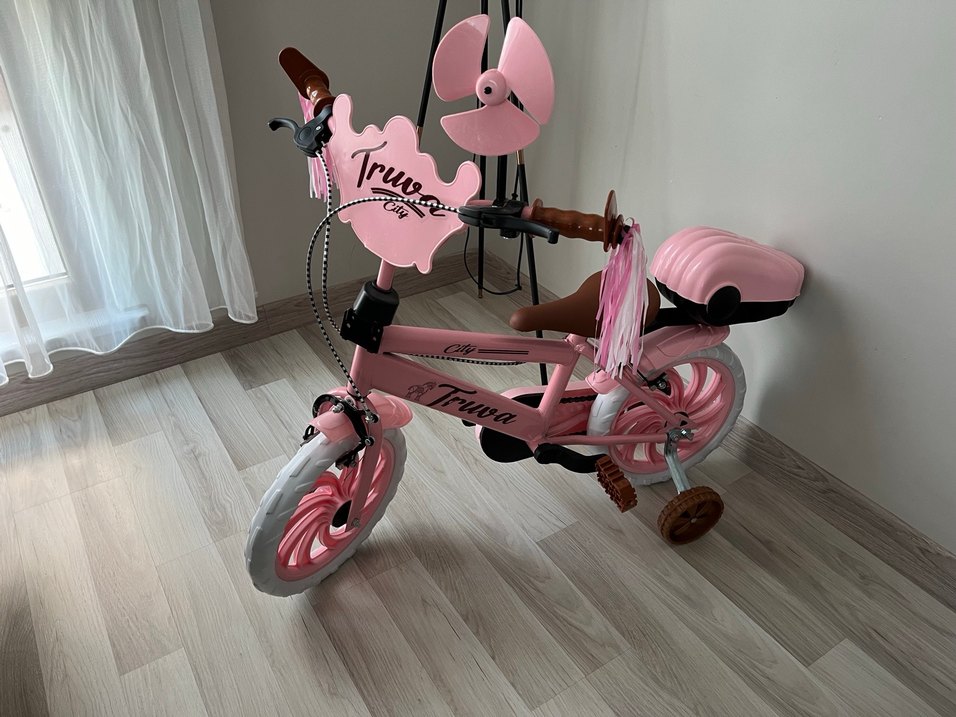Pembe pastel renkte, sağlam gövdeye sahip üç tekerlekli bisiklet. Saplarda püsküller, arkada saklama bölmesi ve önünde oyuncak pervane bulunur. Ön sepeti de mevcut bisikletçide ayarlarını yaptırıp rahatlıkla kullanabilirsiniz. Koltuk ayarı çivi gevşemeleri biz sadece görünsün diye kurduk çünkü. Ya da siz kendiniz kurabilirsiniz İstanbul içi olup da elden almak isteyenleri de aynı şekilde yazabilir.