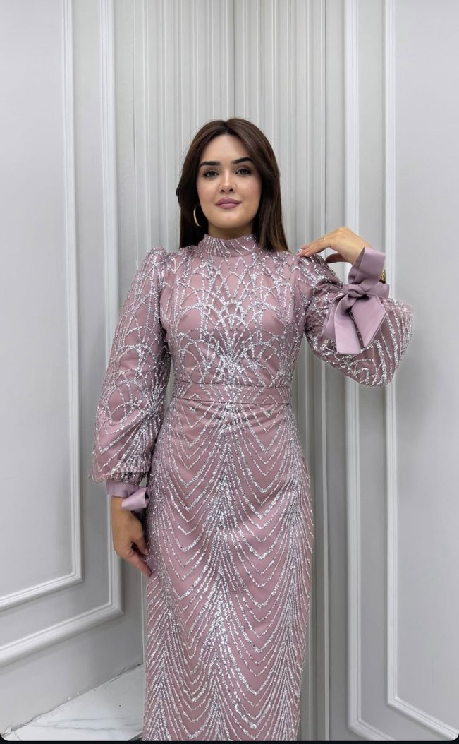 Pembe uzun abiye elbise, yüksek yakalı ve fiyonk detaylı uzun kollu, payet işlemeli desenlerle süslenmiştir. ✨