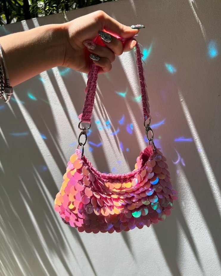 Pembe Payetli Bohem Örgü Çanta