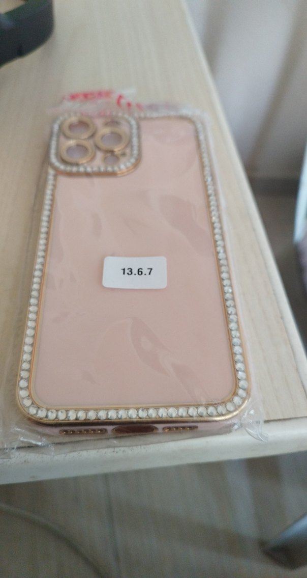 Payetli kenarları ve bohem tarzıyla pastel pembe telefon kılıfı, üzerinde 13.6.7 numarası bulunur. ✨