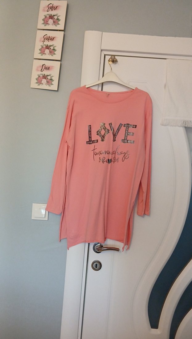 Uzun kollu, yuvarlak yakalı pembe hamile tişörtü. Payetli "LVYE" baskılı ve midi boyda, rahat sokak stili için uygun.