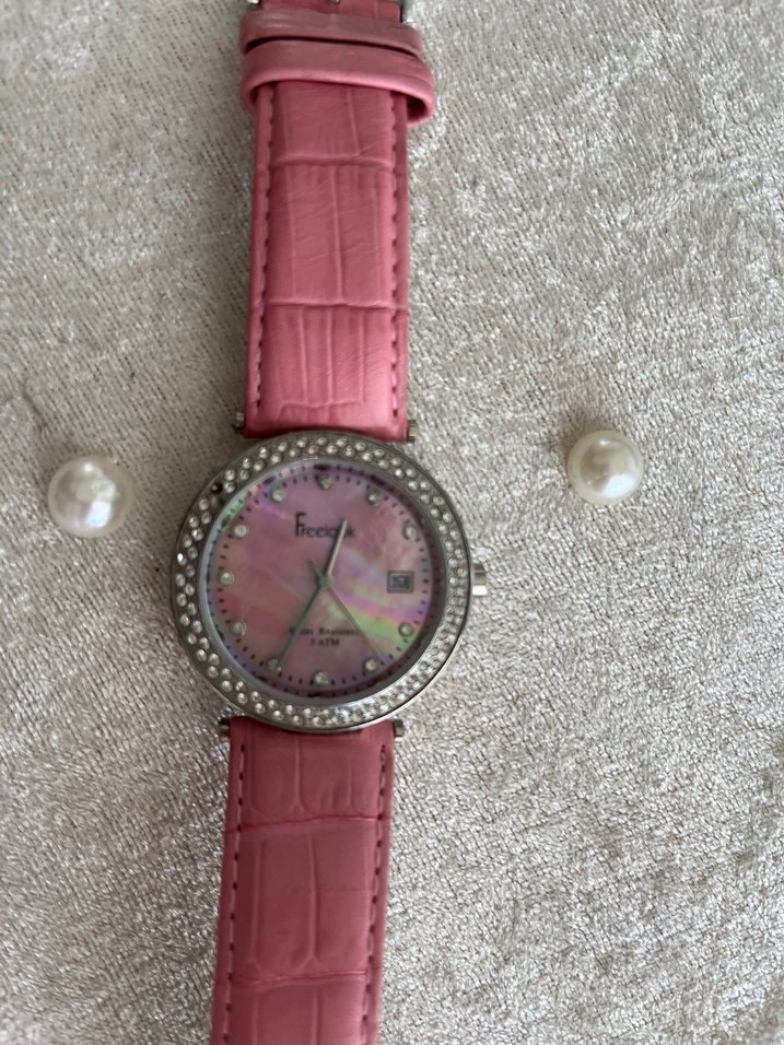Pembe deri kayışlı kadın kol saati, payetli çerçevesi ve tarih göstergeli pembe kadranı ile modern ve şık bir tasarıma sahiptir. ⌚