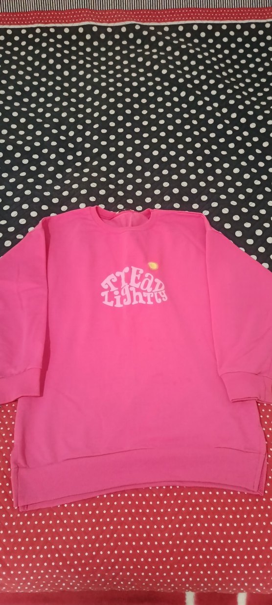 Pembe uzun kollu, yuvarlak yaka ve bol kesim kadın sweatshirt. Renkli baskılı ve payetli, yumuşak ve sıcak kumaştan, trend günlük stil için uygun.