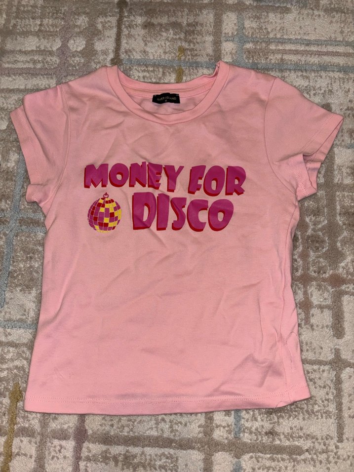Pembe, kısa kollu, dar kesim kadın tişörtü. Payetli diskotek topu ve "MONEY FOR DISCO" yazısı baskılıdır. Parti için uygundur.