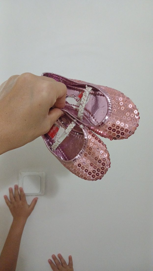 Pembe renkli, payet işlemeli ve cırt cırtlı bantlı kız babet ayakkabısı. Esnek kauçuk malzeme kullanılmıştır.