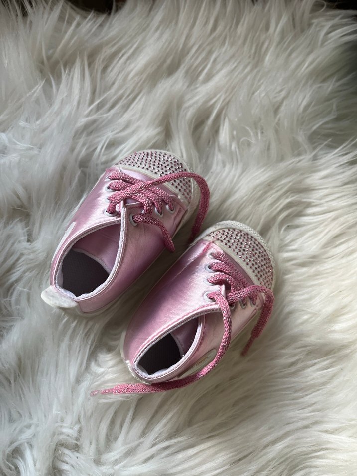Pembe renkli, payet detaylı ve kauçuk tabanlı kız bebek ilk adım ayakkabısı, trend sokak stili için uygundur.