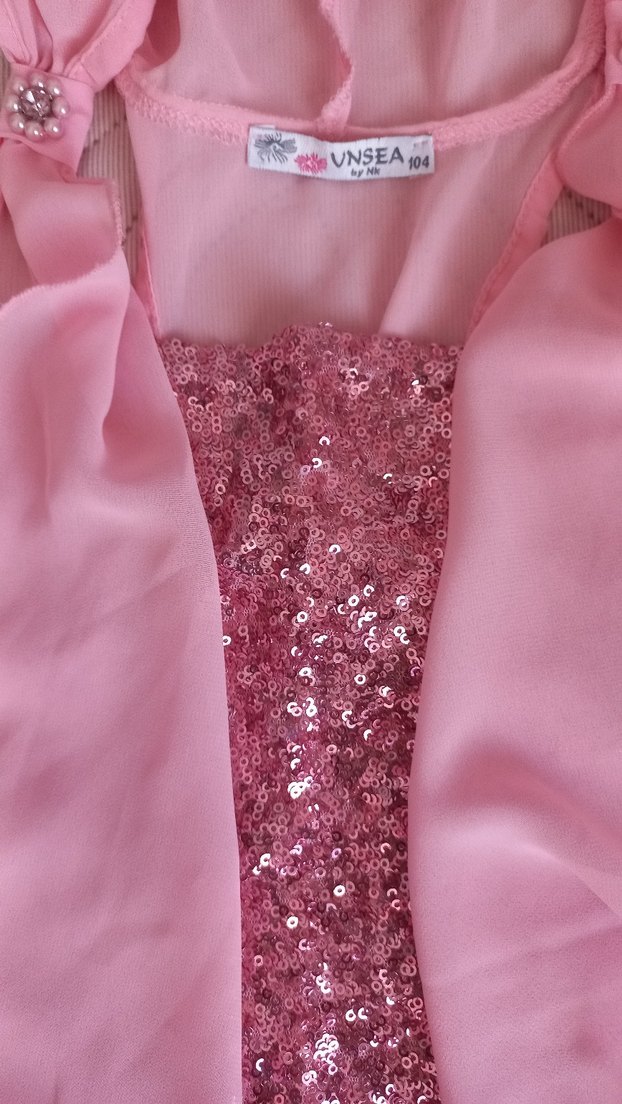 Pembe renkli, payetli ve nakışlı desenli kız bolero. straplez ve ince askılı tul üst, sentetik kumaştan yapılmış, modern tasarıma sahip.