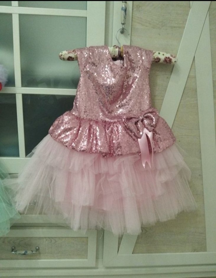 Pembe, straplez, kolsuz kız çocuk elbisesi; payetli üst kısmı ve tüllü, fırfırlı etek kısmı ile şık bir tasarıma sahiptir. sorunusz