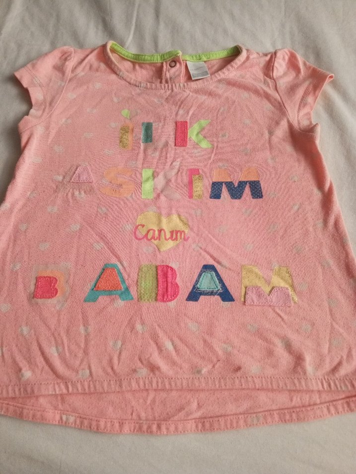 Pamuklu, bol kesim, kısa kollu, yuvarlak yakalı pembe kız çocuk tişörtü. Canum yazılı renkli payet süslemelidir.