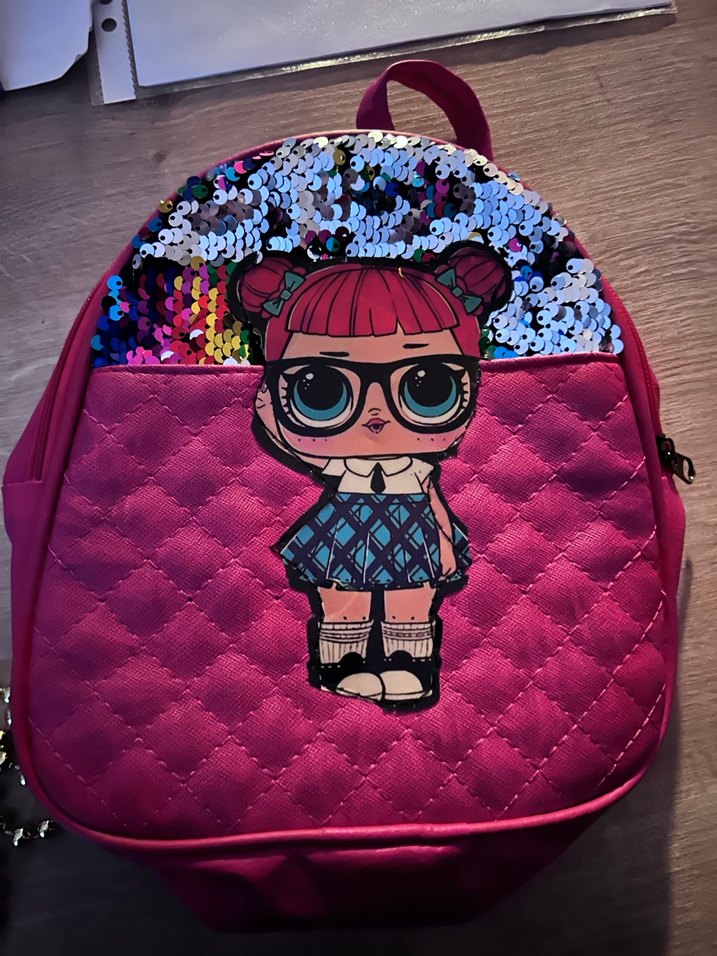 Pembe, renkli payetli ve tokalı kayışlı sırt çantası, baskılı pop kültür figürüyle. Bohem, hippie ve retro tarzlar için uygun.