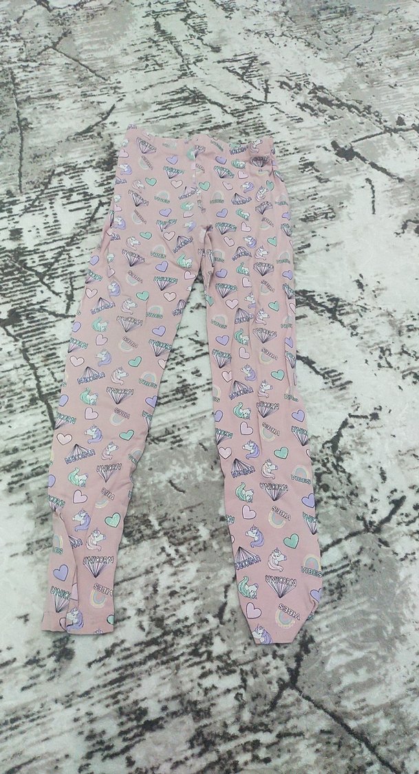 Pembe pastel tonlarında, payetli kalp ve elmas desenli unicor lu, sentetik yumuşak kumaştan yapılmış, fitted kesim kız çocuk taytı.