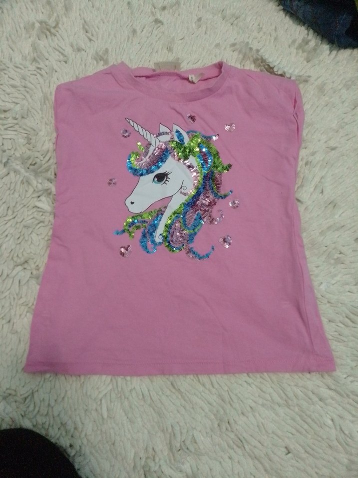 Pembe renkli, kısa kollu, yuvarlak yakalı ve bol kesim kız çocuk tişörtü. Payetlerle süslenmiş, renkli unicorn baskısı bulunur. Yumuşak sentetik kumaştan yapılmıştır.