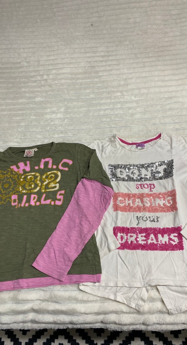 Pamuklu kumaştan, bol kesim, yuvarlak yakalı pembe kız uzun kollu tişört. Payetli renkli baskı ve "stop, DREAMS, CHASING" yazıları içerir.