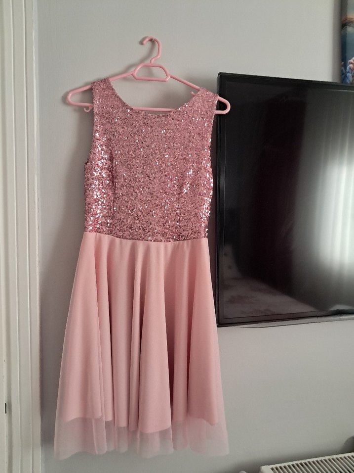 Pembe renkli, payetli üst kısmı ve hafif midi etekli, kolsuz, vücuda oturan abiye elbise. Parti için uygun, ışıltılı ve sade tasarım. ✨