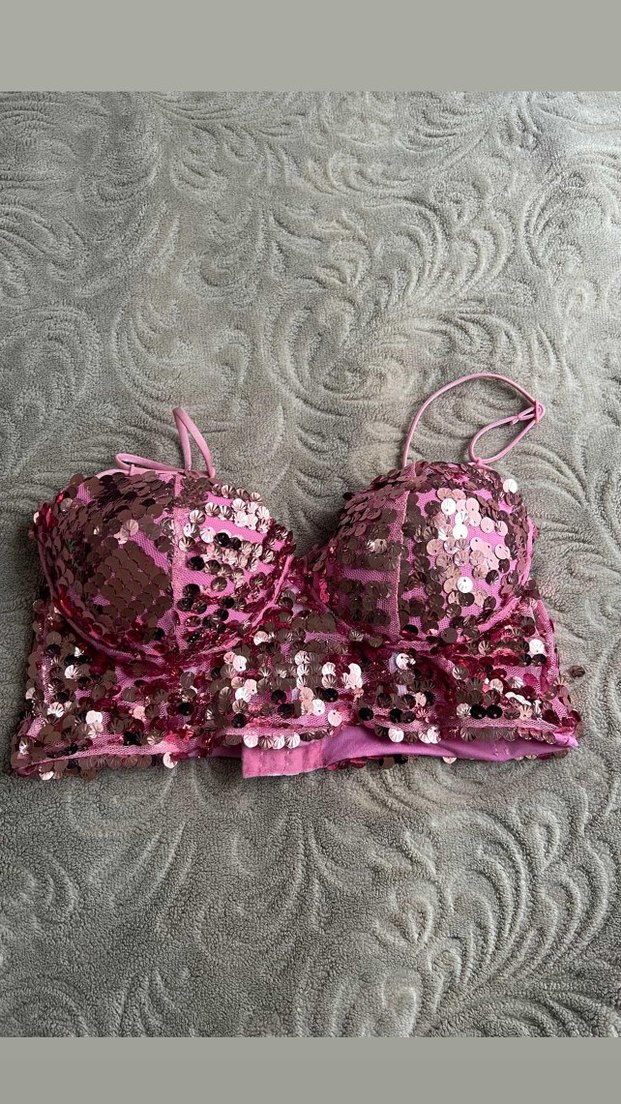 Pembe, koyu payetli ve işlemeli kısa, dar kesim büstiyer, askılı ve straplez yakaya sahip, gösterişli parti tarzı için uygun. ✨