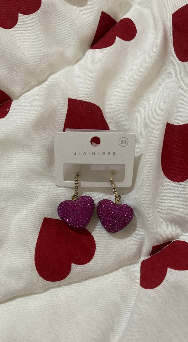 Pembe kalp şeklinde, renkli payetlerle süslenmiş kısa uzunlukta küpeler. Paslanmaz malzemeden üretilmiş, romantik buluşmalar için uygun.