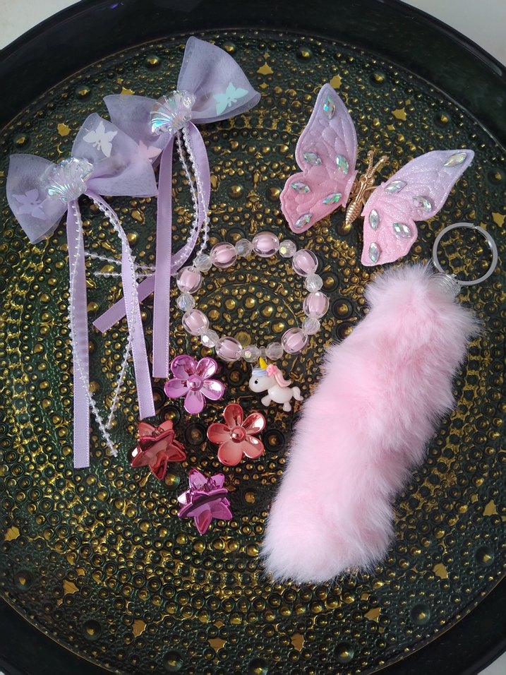 Pastel pembe tonlarında, payetli ve nakışlı tasarımlara sahip çocuk saç aksesuarları seti. Fiyonklar, kelebek tokalar ve tüylü anahtarlık içerir.