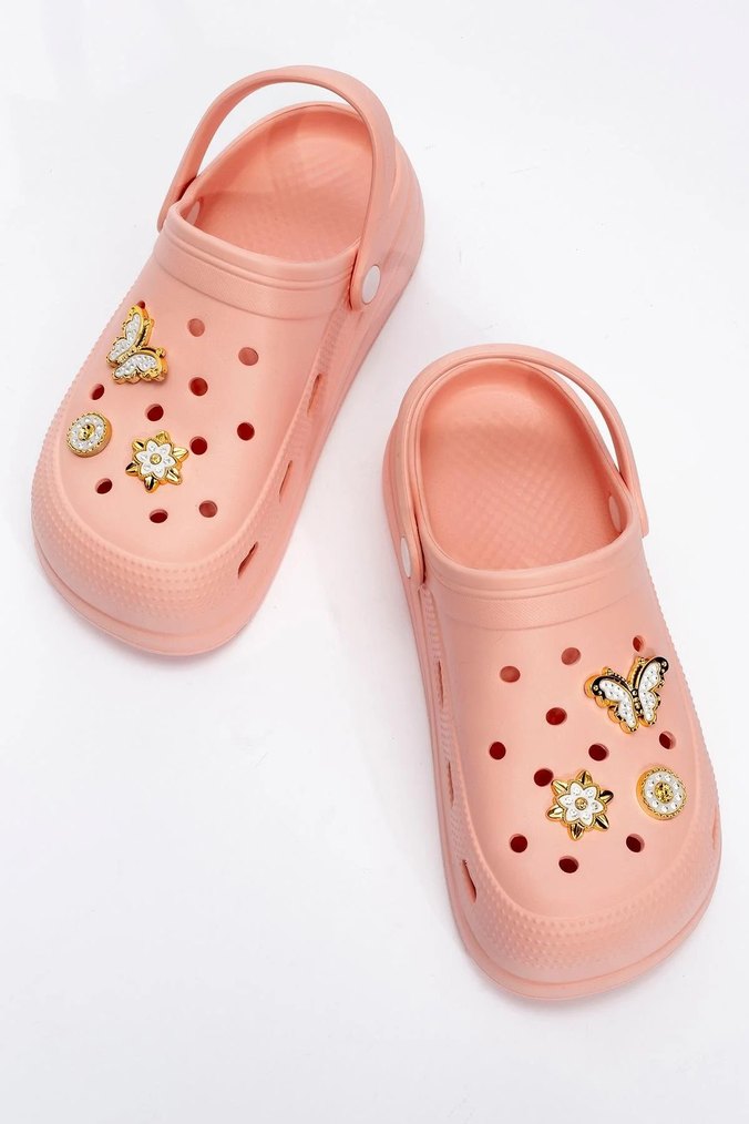 Pastel pembe platform topuklu kadın terlik, payetli ve nakış detaylara sahip, yumuşak kauçuk malzemeden üretilmiş, trend ve rahat kullanıma uygun.