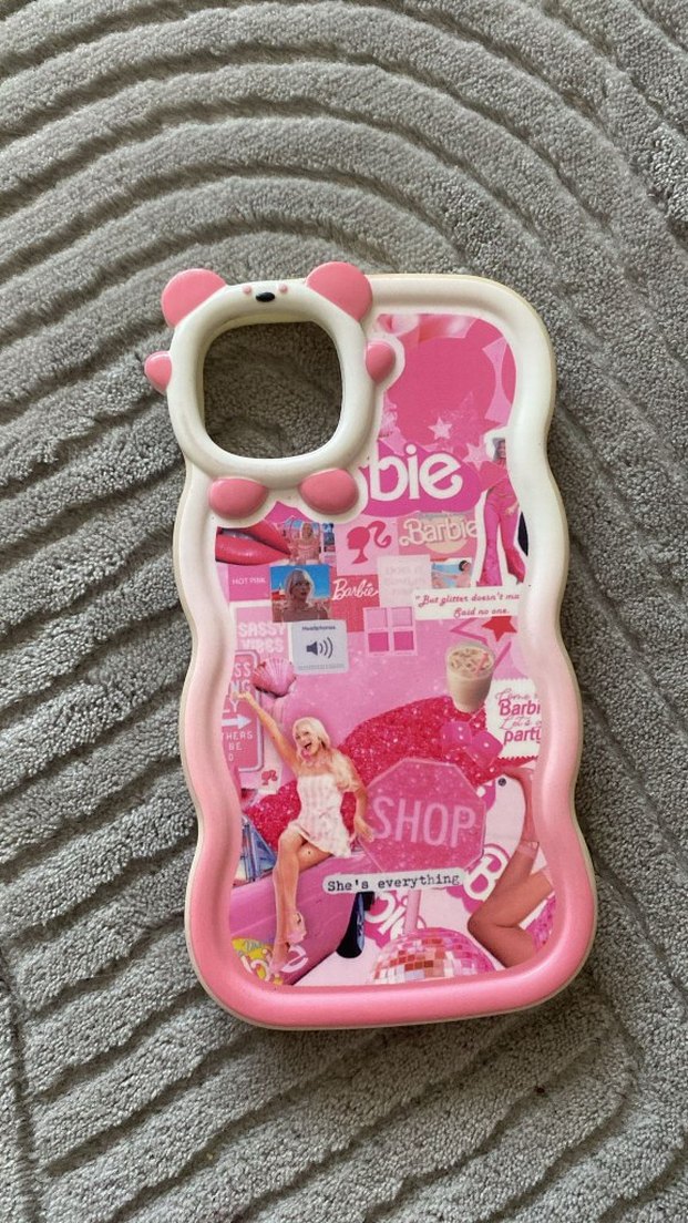 Pastel pembe renkli, payetli ve pop kültür temalı Barbie kolaj desenli telefon kılıfı. Kamera çevresi oyuncak ayı şeklinde detaylıdır. iPhone 11 için uygundur.