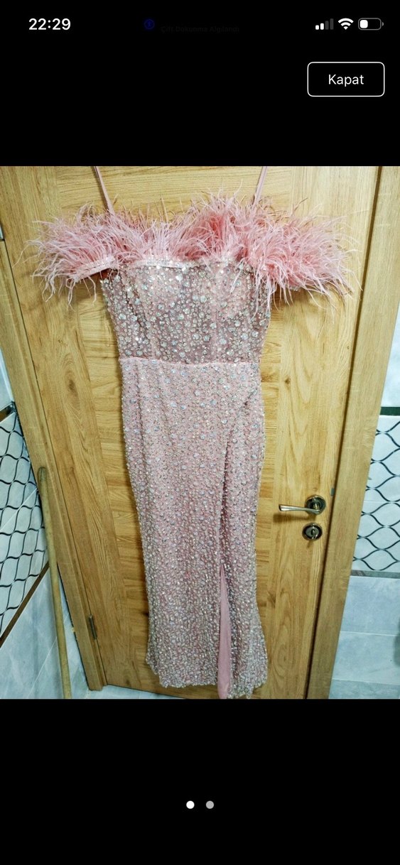 Pudra pembe, payetli ve işlemeli, straplez askılı uzun elbise. İnce kesimi ve tüy detaylarıyla bohem ve göz alıcı bir tarz sunar.