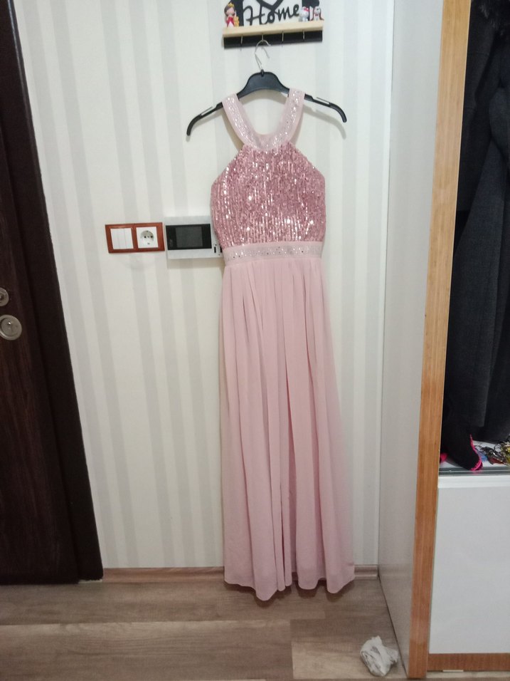Uzun pembe abiye elbise, payetli ve vücuda oturan üst kısmı ile dikkat çeker. Askısız ve kolsuz, modern klasik tarzda düğünler için uygundur.