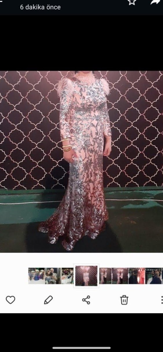 Parlak detaylı, uzun kollu ve kapalı yaka pembe bakır rengi abiye elbise, klasik şık bir abiyedir püskül detayları cıkarılablir bir kez kardeşimin nişanında giydim