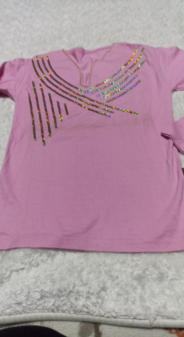 Bu kız tişörtü, V yaka ve uzun kolludur. Yumuşak sentetik kumaştan yapılmış, bol kesim ve renkli payetli baskı detaylarına sahiptir.