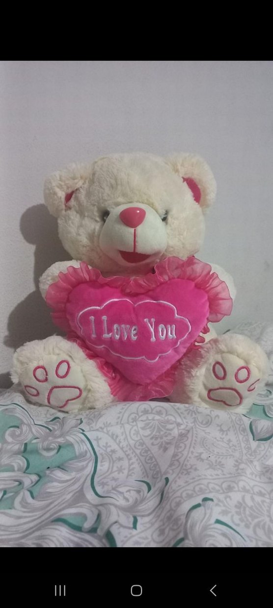 Yumuşak peluş ayıcık, "I Love You" yazılı pembe kalp tutuyor. Renkli ve sevimli,