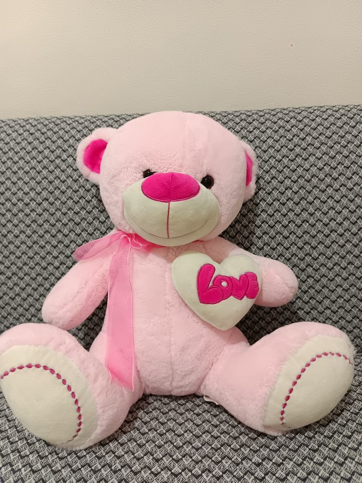 Yumuşak pembe peluş ayıcık, üzerinde renkli 'Love' yazılı kalp ve boynunda uyumlu kurdele bulunur. 45 cm yırtığı söküğü yoktur marka temsilidir