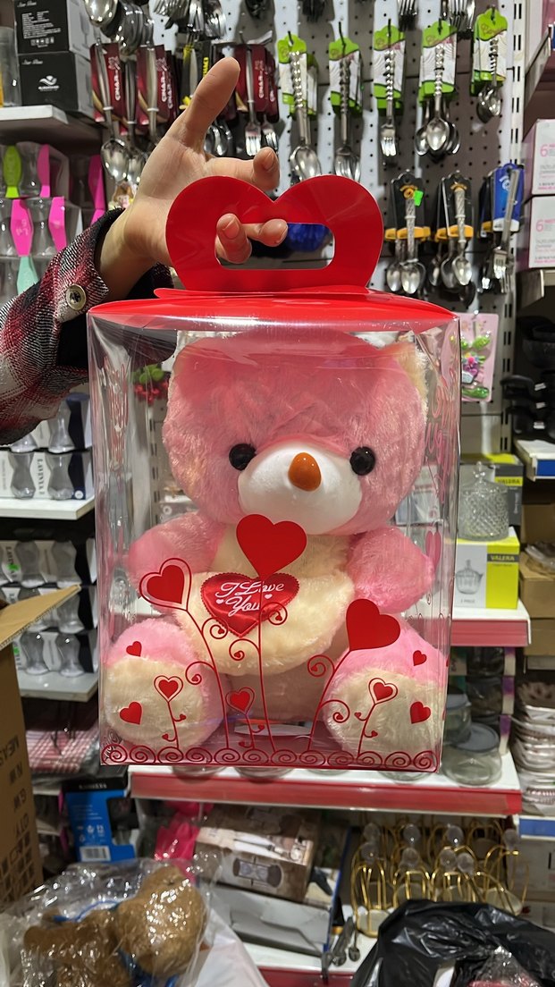 Yumuşak ve renkli pembe peluş ayıcık, kalp desenli şeffaf kutuda. Kolay taşımak için kırmızı kalp sapı bulunur. ❤️