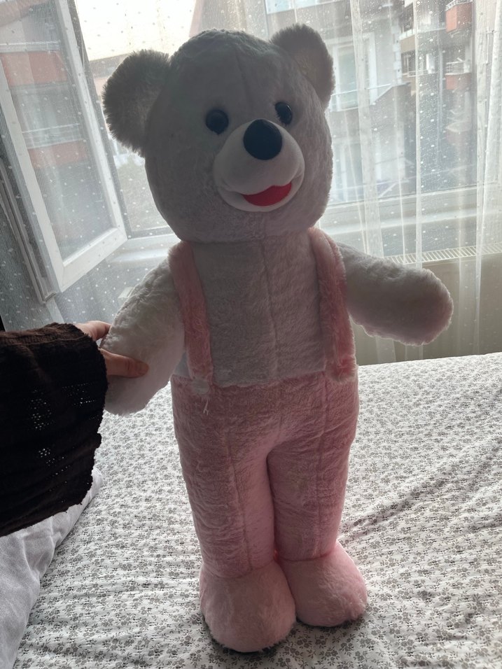 Pastel pembe tulum giymiş yumuşak ve sevimli peluş ayıcık oyuncak . Peluş sadece dik duran bir peluş oyuncaktır. Bir düğmesi sadece kayıp onun dışında bir sorunu bulunmamaktadır oraya da bir düğme kolayca dikilebilir tekliflere açığım