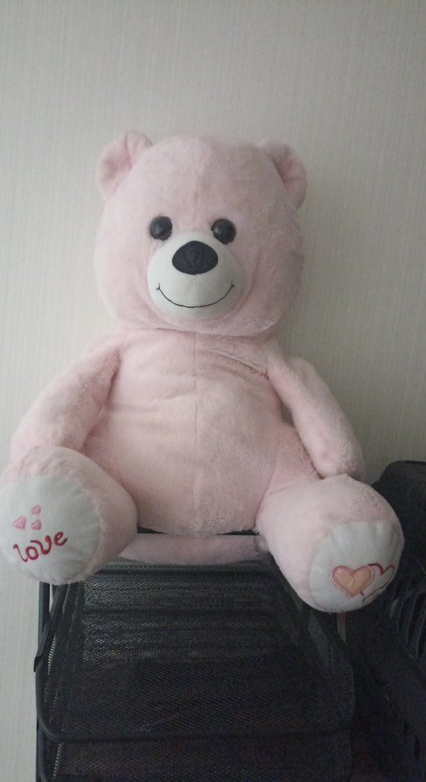 Pastel pembe renkte, yumuşak kumaştan yapılmış peluş ayıcık oyuncak. Pati üzerinde "love" yazısı işlenmiştir.