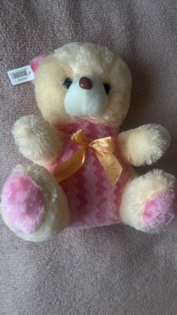 Yumuşak peluş ayıcık, pastel pembe detaylar ve boynunda sarı kurdele ile rahatlatıcı oyuncak.