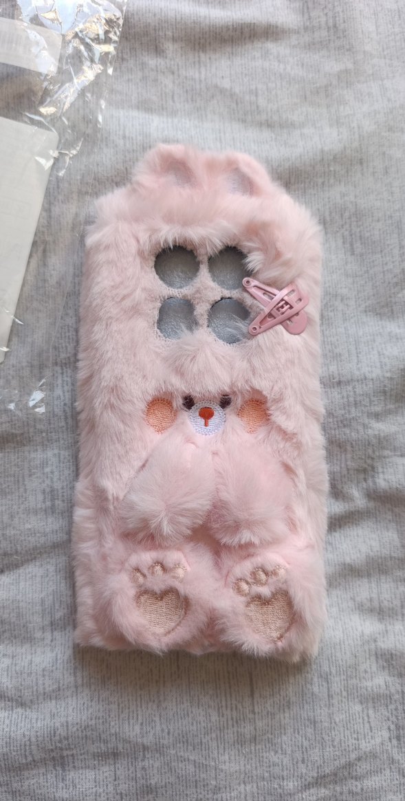 Yumuşak peluş kaplı, pembe pastel renkli telefon kılıfı. Sevimli ayıcık ve pati detaylarıyla normcore tarzda.