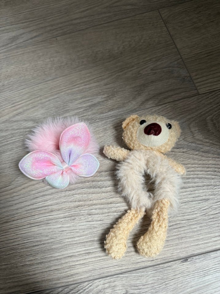 Yumuşak dokulu pastel pembe peluş ayıcık ve tüy detaylı pastel pembe çiçek aksesuarı. Dekoratif oyuncak olarak uygun.