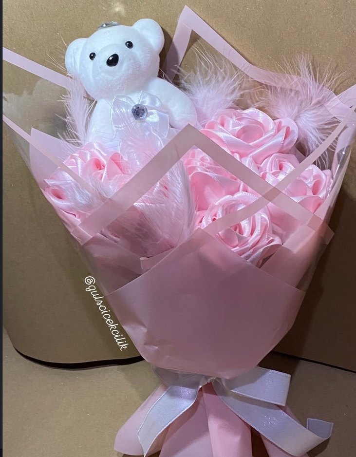 Pembe Peluş Ayıcık ve Yapay Çiçek Buketi