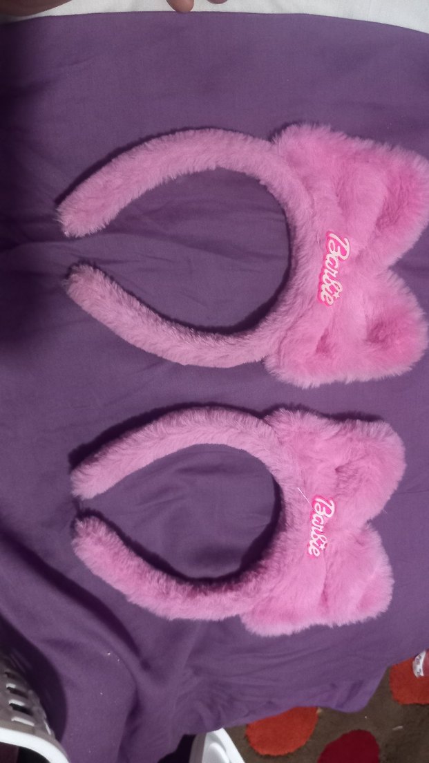 Pembe peluş çocuk saç bantları, cesur sokak stili, pastel tonlar ve baskılı Barbie logosu ile. Yumuşak ve rahat.
