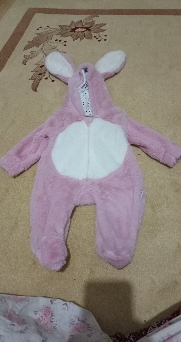 Peluş detaylı, kapüşonlu ve kulaklı pembe bebek kız tulumu. Önünde beyaz peluş detay ve ayakları kapalıdır. Çok az kullandim