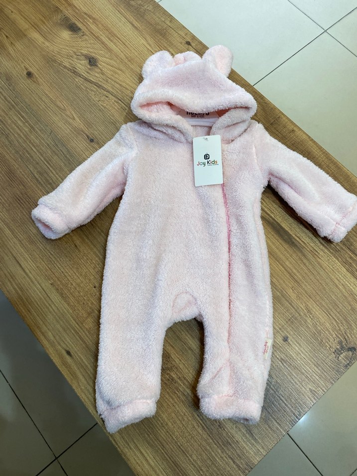 Peluş detaylı, kapüşonlu ve kulaklı pastel pembe bebek kız tulumu. Desensiz, yumuşak ve sıcak dokusu ile rahatlık sağlar.