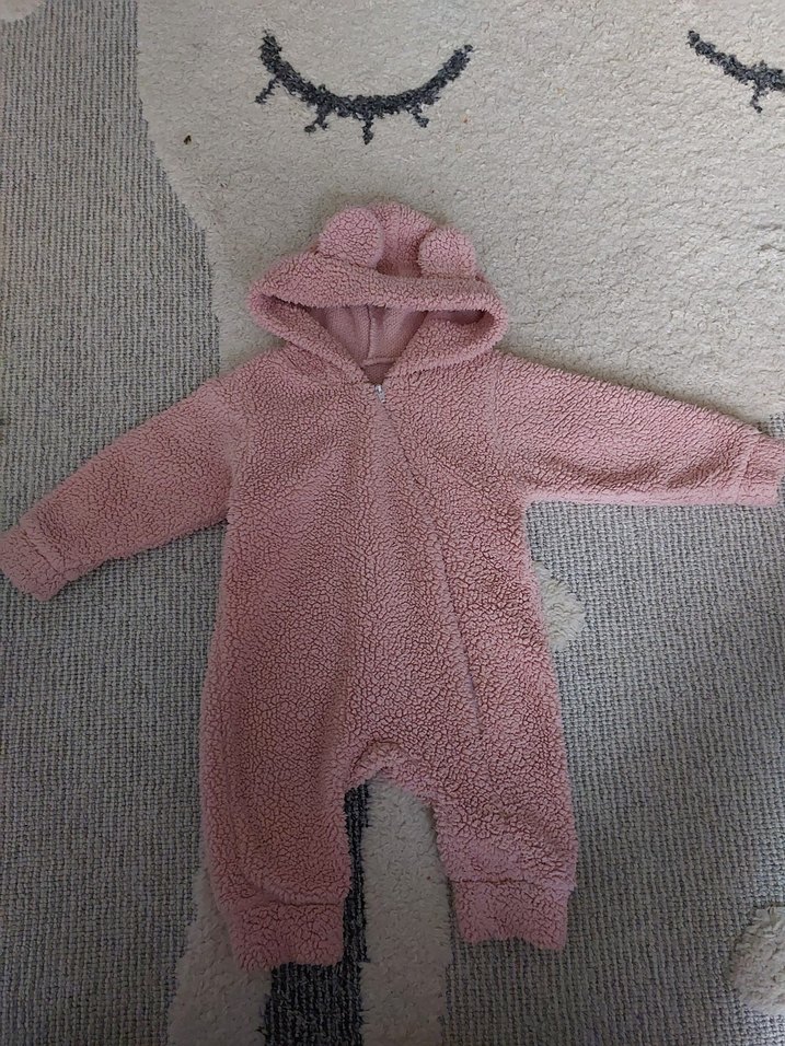 Pastel pembe renkte, yumuşak ve sıcak peluş kumaştan yapılmış, kulaklı kapüşonlu bebek tulumu.