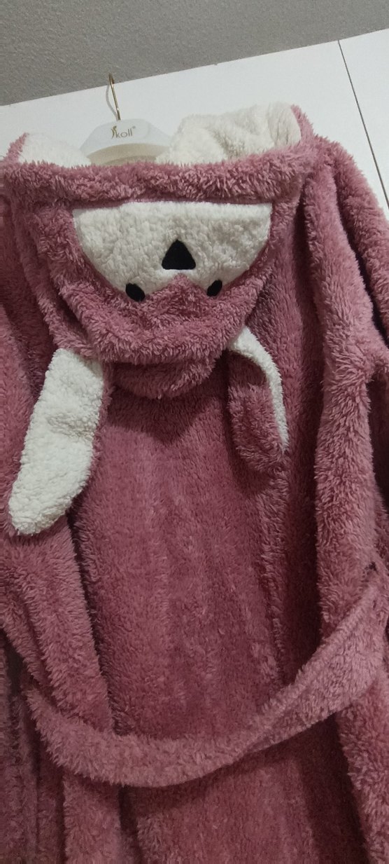 Yumuşak ve sıcak kumaştan yapılmış, kapüşonunda sevimli hayvan kulakları ve yüz detayları bulunan pembe pastel bornoz. #bornoz #polarbornoz