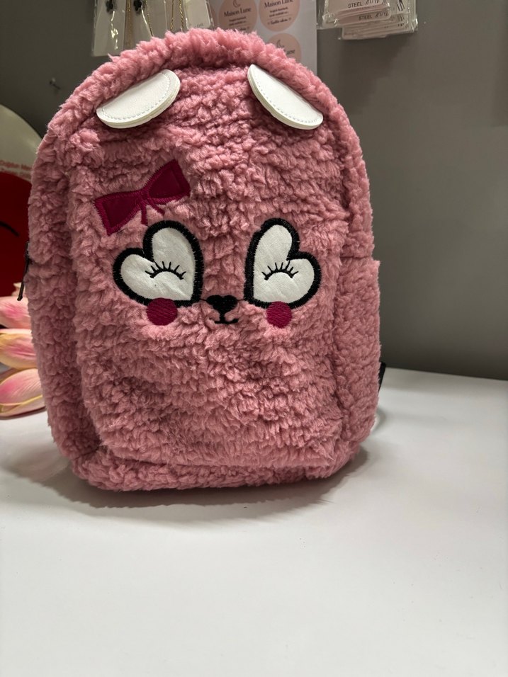 Yumuşak ve peluş pembe çocuk okul çantası, önünde sevimli hayvan yüzü ve fiyonk detayıyla.