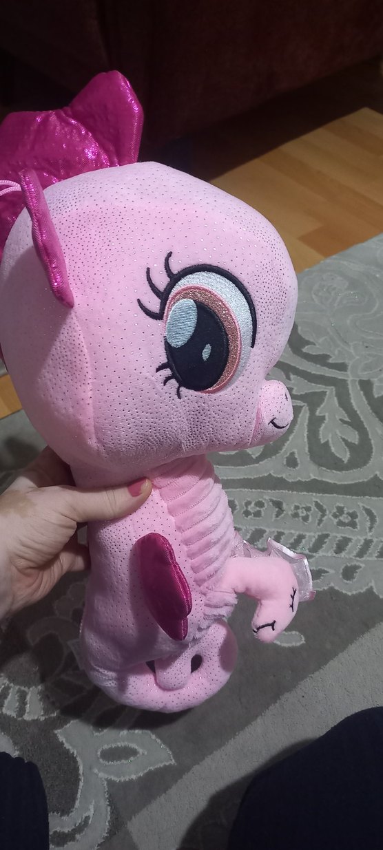 Yumuşak pembe peluş denizatı oyuncak, detaylı nakışlı büyük gözler ve pastel tonlarda küçük yüzgeçlerle.