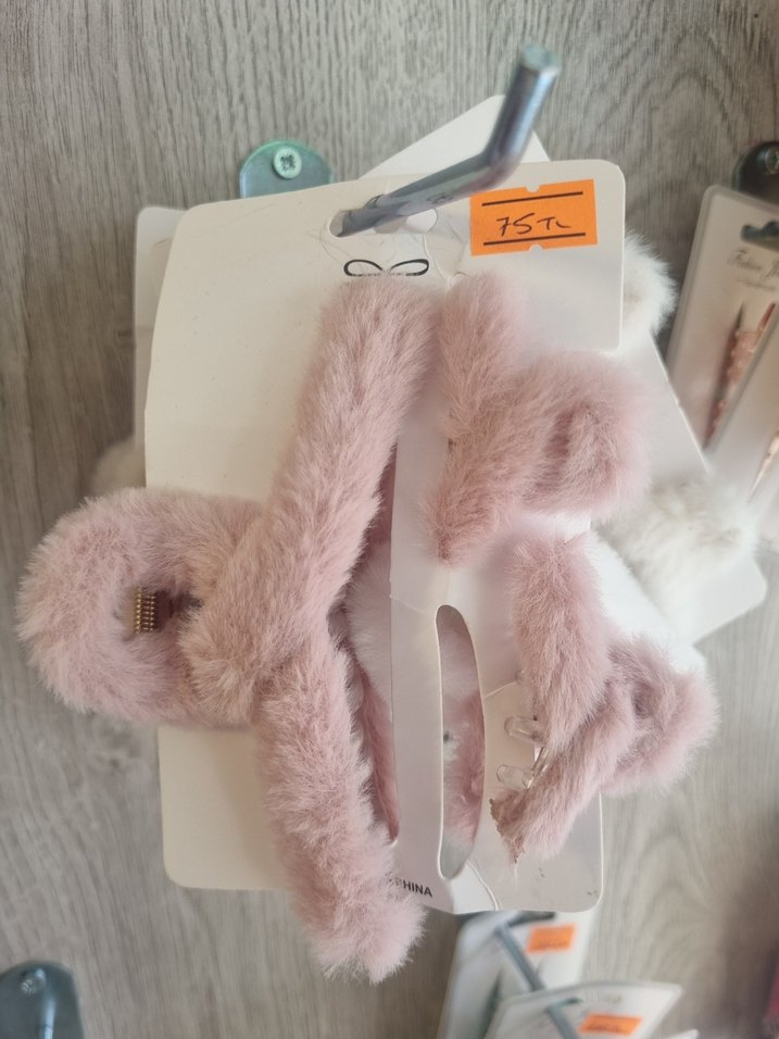 Pastel pembe renkte, yumuşak peluş detaylara sahip çocuk tokası seti, moda tutkunları için ideal.