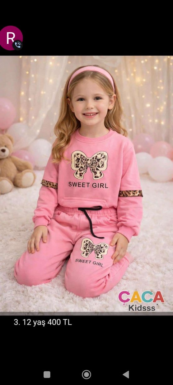 Pembe peluş kumaştan, bol kesim kız sweatshirt ve eşofman. Uzun kollu, yuvarlak yaka, baskılı fiyonklu ve kürk detaylıdır. Pastel tonlarda.